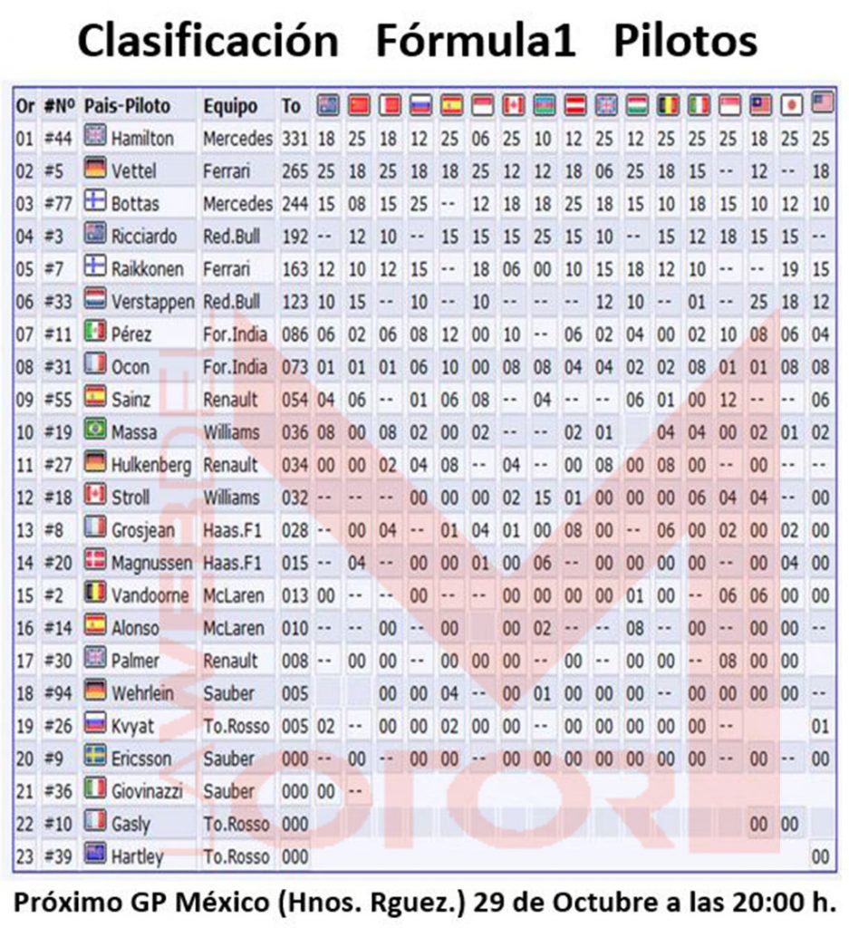 Clasificaciones Oficiales del Mundial F1 pilotos y equipos