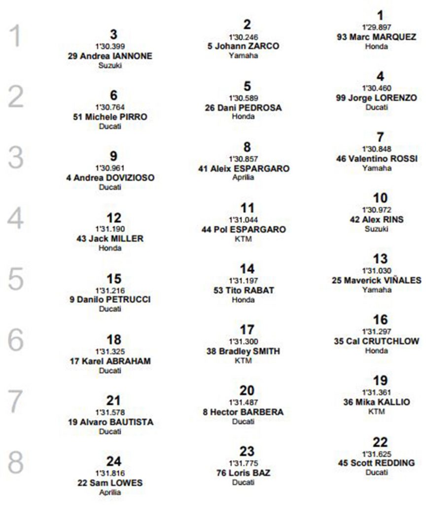 - Andrea Iannone vuelve a la primera fila por primera vez desde la carrera inaugural del año en Catar. Iannone terminó tercero el año pasado en Valencia con Ducati, que es el único podio del fabricante italiano en este circuito en los últimos seis años.