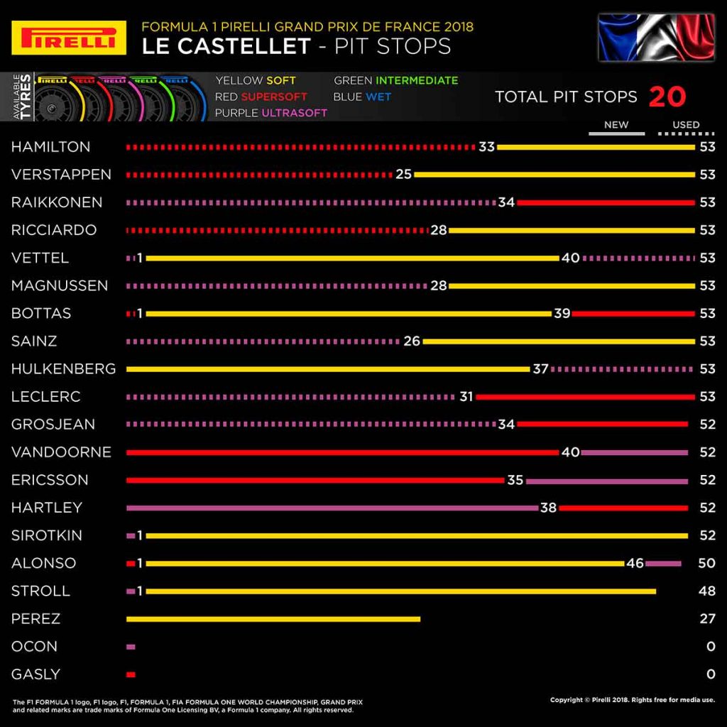 ESTRATEGIAS: Lewis Hamilton ganó la carrera usando una estrategia de una única parada (como se esperaba), cambiando de superblando a blando en la vuelta 33. Ésta fue la misma táctica adoptada por Max Verstappen, finalmente segundo bajo la bandera a cuadros, aunque el piloto de Red Bull se detuvo mucho antes. Kimi Raikkonen, que ocupó el tercer peldaño del podio, optó por una opción completamente diferente, comenzando con ultrablandos y terminando con superblandos. Ésto permitió al finlandés hacer un stint crucial en las últimas fases de la carrera que le valió ese podio.
