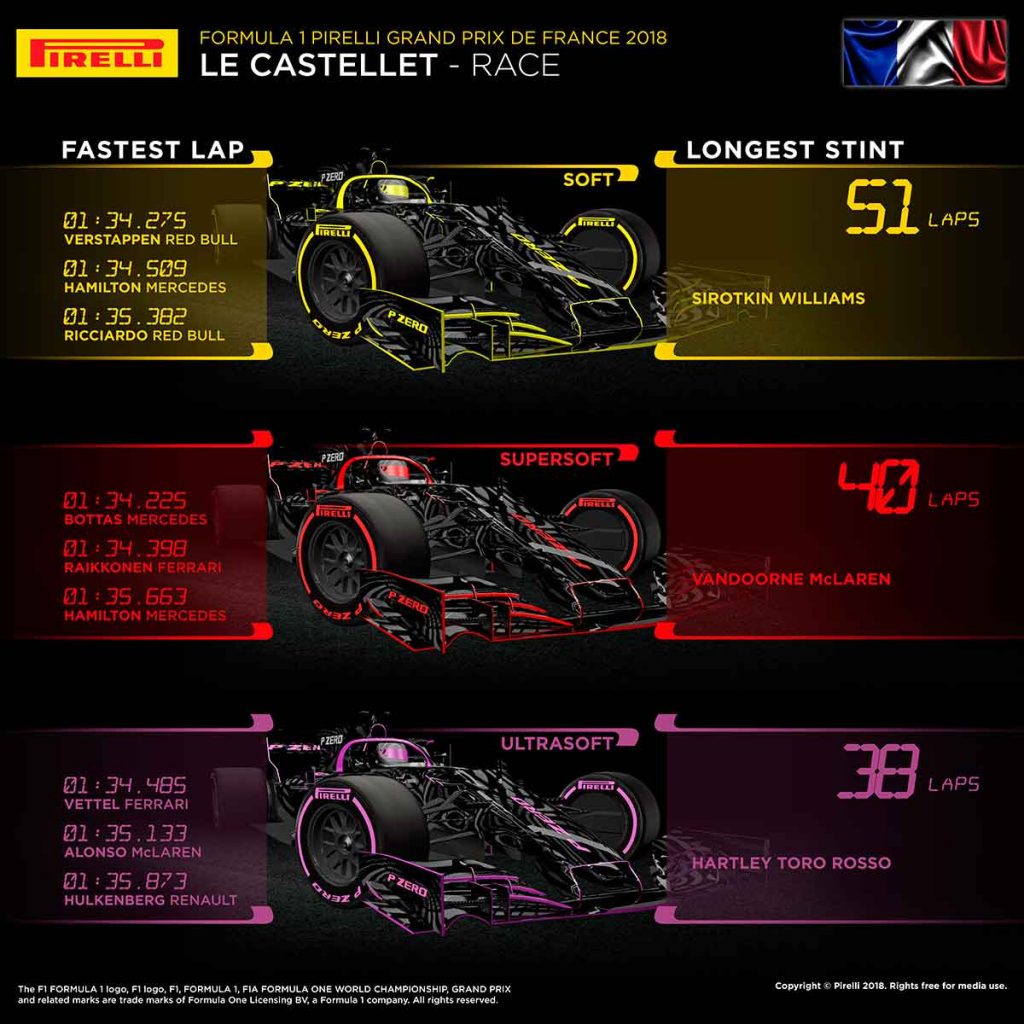 Lewis Hamilton ganó una carrera para Mercedes que estuvo fuertemente influenciada por una caótica primera vuelta, en la que, entre otros incidentes, dos de sus rivales se tocaron y un coche de seguridad estuvo en la pista durante cinco vueltas. Varios pilotos hicieron una parada en boxes debajo el régimen de safety car desplegado debido a daños en el coche, especialmente el piloto de Ferrari Sebastian Vettel y el piloto de Mercedes Valtteri Bottas, que cambiaron al neumático blando en la segunda vuelta antes de hacer una segunda parada en las últimas fases de la carrera. Ambos terminaron en los puntos después de haber caído hasta el final del ‘pelotón’, y verse obligados a modificar la estrategia de carrera para ascender en la tabla de clasificación cuando sus rivales se detuvieron más tarde en sus respectivas paradas. La estrategia inicial de Mercedes y Red Bull fue la de empezar con superblandos en vez de hiperblandos y tanto el vencedor Hamilton como el segundo bajo la bandera a cuadros Max Verstappen, cambiaron a blandos para la fase final de la carrera. En cambio, el piloto de Ferrari Kimi Raikkonen, adoptó una estrategia diferente, aunque también de una única parada que también fue premiada con un escalón en el podio. Hamilton se llevó un trofeo especial de un gorila tricolor por su victoria, diseñado por el célebre escultor francés Richard Orlinski para celebrar el patrocinio de Pirelli del Gran Premio de Francia.