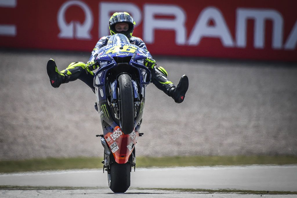 Rossi acabó en el segundo lugar del podio, y su compañero Viñales acabó tercero, respetando exactamente el orden en la general del campeonato. Primero Petrucci y más tarde Bautista dieron buena cuenta de Lorenzo, dejando al mallorquín en la sexta plaza de la carrera con unas gomas muy desgastadas tras el tirón inicial.