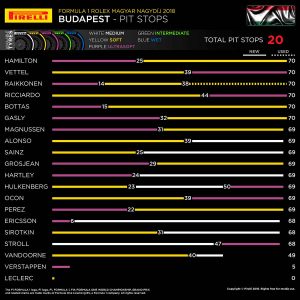 Sin embargo, el de Ferrari Sebastian Vettel, utilizó una estrategia inversa de blandos a ultrablandos y le sirvió para acabar segundo saliendo desde la cuarta posición de la parrilla, la misma que utilizó el piloto de Red Bull Daniel Ricciardo que ascendió desde el 12º al 4º lugar final. El otro Ferrari, el del finlandés Kimi Raikkonen, fue a por una estrategia de dos paradas y finalmente terminó en el podio tras Hamilton y Vettel.
