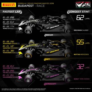 • Respecto a los stints el más largo con ultrablandos lo hizo Gasly que rodó 32 vueltas, con blandos Bottas que dio 55 vueltas mientras que con medios el que más vueltas dio fue Ericsson, 62.