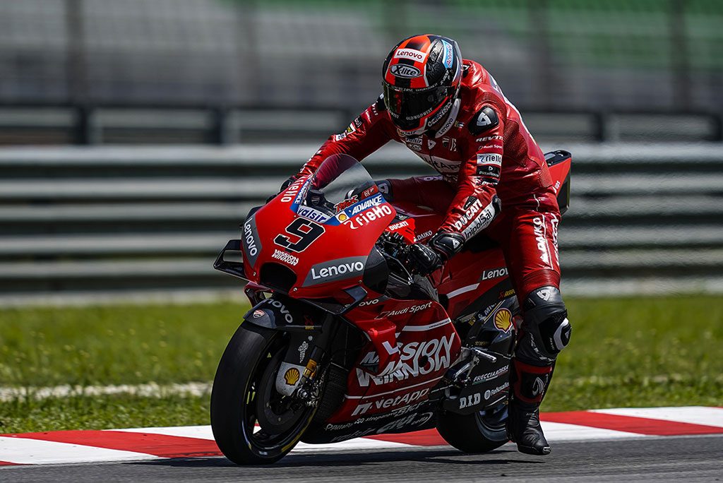 Petrucci ha completado 32 vueltas y su mejor registro ha sido un estratosférico 1’58″239 con el que se ha colocado primero. Dovizioso ha terminado cuarto con un tiempo de 1’58″538, a 0.299 milésimas de su compañero de equipo, y con 36 vueltas a sus espaldas. Durante la jornada los pilotos Ducati también han probado un nuevo carenado aerodinámico con el que se han obtenido datos positivos.
