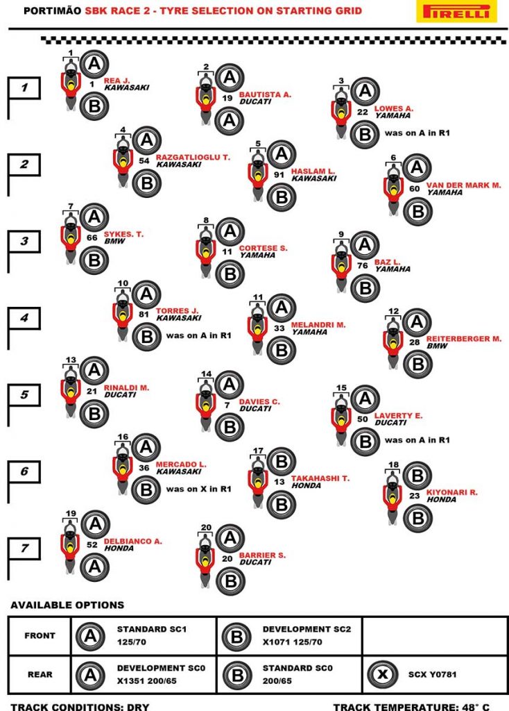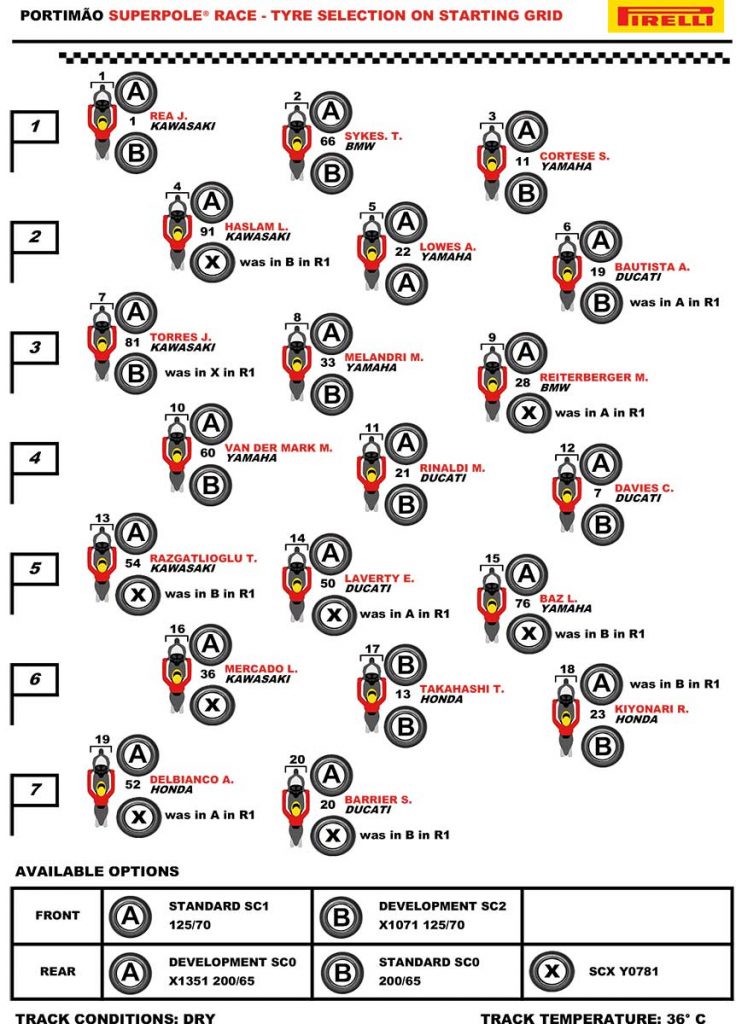 El fin de semana en el Algarve permitió a Pirelli obtener más información sobre los neumáticos estándar en los tamaños más grandes. De hecho, los slicks traseros DIABLO Superbike SC0 en el tamaño 200/65 y los delanteros SC1 en 125/70 (neumáticos que ya se venden habitualmente en el mercado abierto), fueron utilizados por la gran mayoría de los pilotos del WorldSBK, lo que confirma el rendimiento excepcional de estas gomas. El objetivo de Pirelli es ahora completar la gama con los compuestos restantes que componen la gama de los tamaños tradicionales.