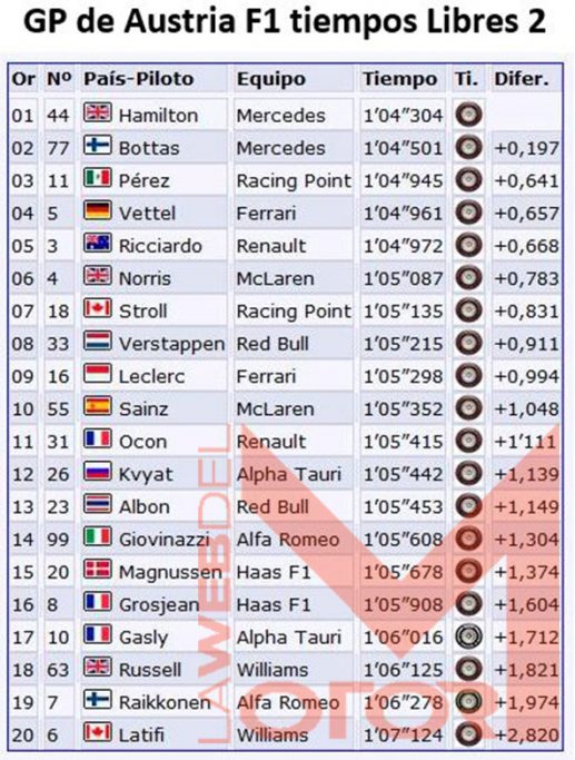 Mario Isola, jefe de Pirelli F1: “Como se esperaba, hubo una brecha relativamente pequeña en términos de rendimiento entre los tres compuestos en el Red Bull Ring, debido a que aquí la vuelta es muy corta, de poco más de un minuto. A pesar de que ha pasado un tiempo muy largo desde que los pilotos estuvieron en la pista por última vez, los tiempos más rápidos en ambas sesiones de libres de hoy fueron ligeramente más rápidos que sus equivalentes del año pasado, lo que confirma el desarrollo de los coches que han utilizado exactamente los mismos neumáticos que en 2019. Hubo mucha evolución en la pista tras la lluvia que cayó en Spielberg la pasada noche, lo que llevó a que pudiéramos ver brevemente los neumáticos intermedios en FP1. Con varios equipos desafiando entrar entra los 10 primeros y con una vuelta tan corta, es más que probable que se necesite el blando para garantizar estar en la Q3, y por este motivo es probable que hayamos visto a muchos pilotos concentrarse en tandas largas con el neumático blando y el medio para así reservar gomas blandas para mañana”. [fuente y fotos Pirelli F1]
