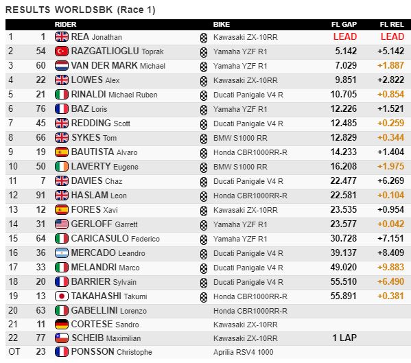 - Ganador del PREMIO PIRELLI A LA MEJOR VUELTA: J. Rea (Kawasaki Racing Team WorldSBK / Kawasaki ZX-10RR) en 1’42”075 en la cuarta vuelta