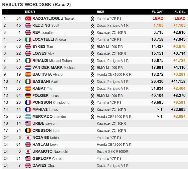 Rea cerró la brecha detrás de Razgatlioglu, pero no le pudo adelantar y en la penúltima vuelta, debido a un error que le dejó fuera, se vio obligado a ceder el segundo lugar a Scott Redding, por lo que bajo la bandera a cuadros el primero en pasar fue el turco Toprak Razgatlioglu.