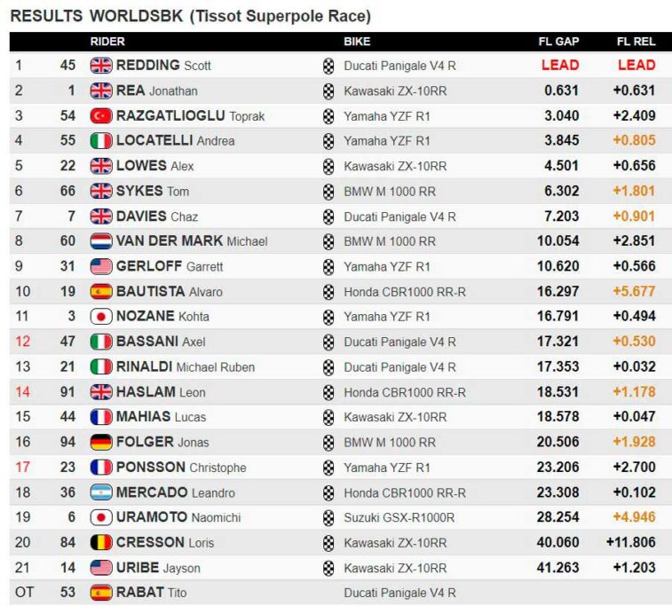 • Ganador del PREMIO PIRELLI A LA MEJOR VUELTA: Scott Redding (ARUBA.IT Racing – Ducati / Ducati Panigale V4 R) , en 1’37”065 en la quinta vuelta