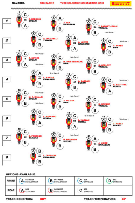 En la Tissot Superpole Race la mayoría de los pilotos de la parrilla eligieron correr con el neumático SCX estándar súper blando (opción A) en la rueda trasera y el SC1 estándar blando (opción C) en la delantera. Por la tarde, en la carrera 2 de WorldSBK, los pilotos confirmaron sus elecciones del día anterior en la rueda trasera, con la solución de desarrollo A0557 SCX (opción B) montada en la mayoría de las máquinas, mientras que para la delantera la solución más utilizada fue la estándar SC1 (opción C).