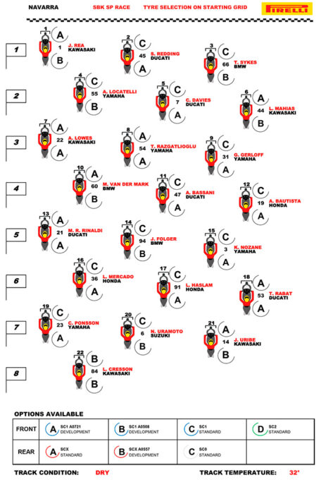 Para la carrera Tissot Superpole todos los pilotos de la parrilla corrieron con neumáticos del compuesto SC1 en la rueda delantera y neumáticos SCX en la trasera. Específicamente, la solución SC1 estándar (opción C) fue la favorita en la delantera, con el resto de la parrilla utilizando la solución de desarrollo A0721 SC1 (opción A) y solo un piloto, Loris Cresson (TPR Team Pedercini Racing / Kawasaki ZX-10RR) optó por la solución de desarrollo A0508 SC1 (opción B). Para la rueda trasera, la mayor parte de la parrilla fue con el SCX estándar (opción A), mientras que los nueve pilotos restantes usaron la solución de desarrollo A0557 SCX (opción B).